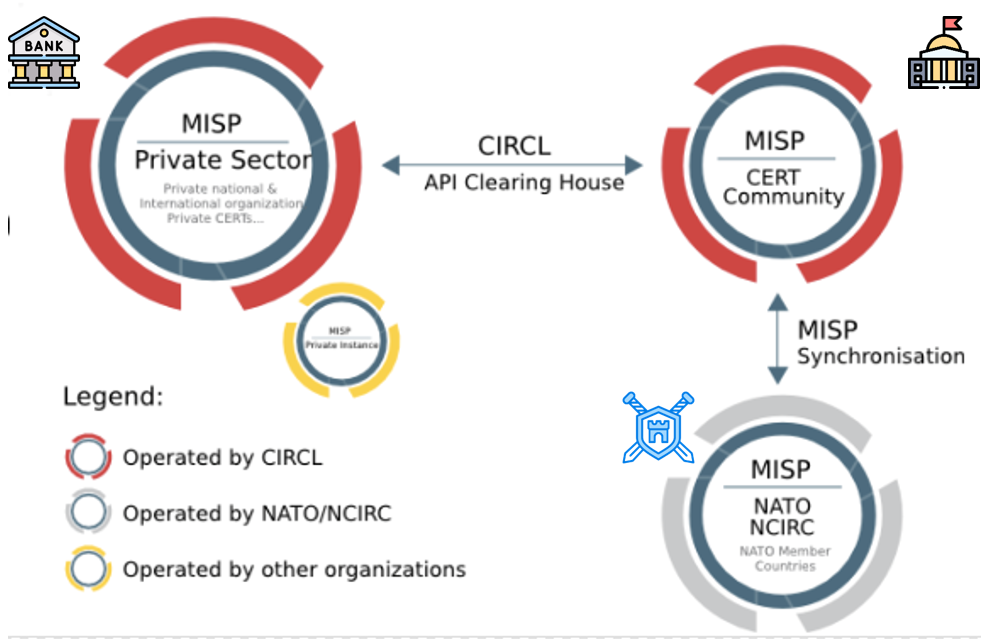In the example above you can see a community with a focus on the private sector, for example banks, interconnected with a community run by a national computer emergency response team (for example CIRCL). This last community is then in turn connected to a community with a more military focus.