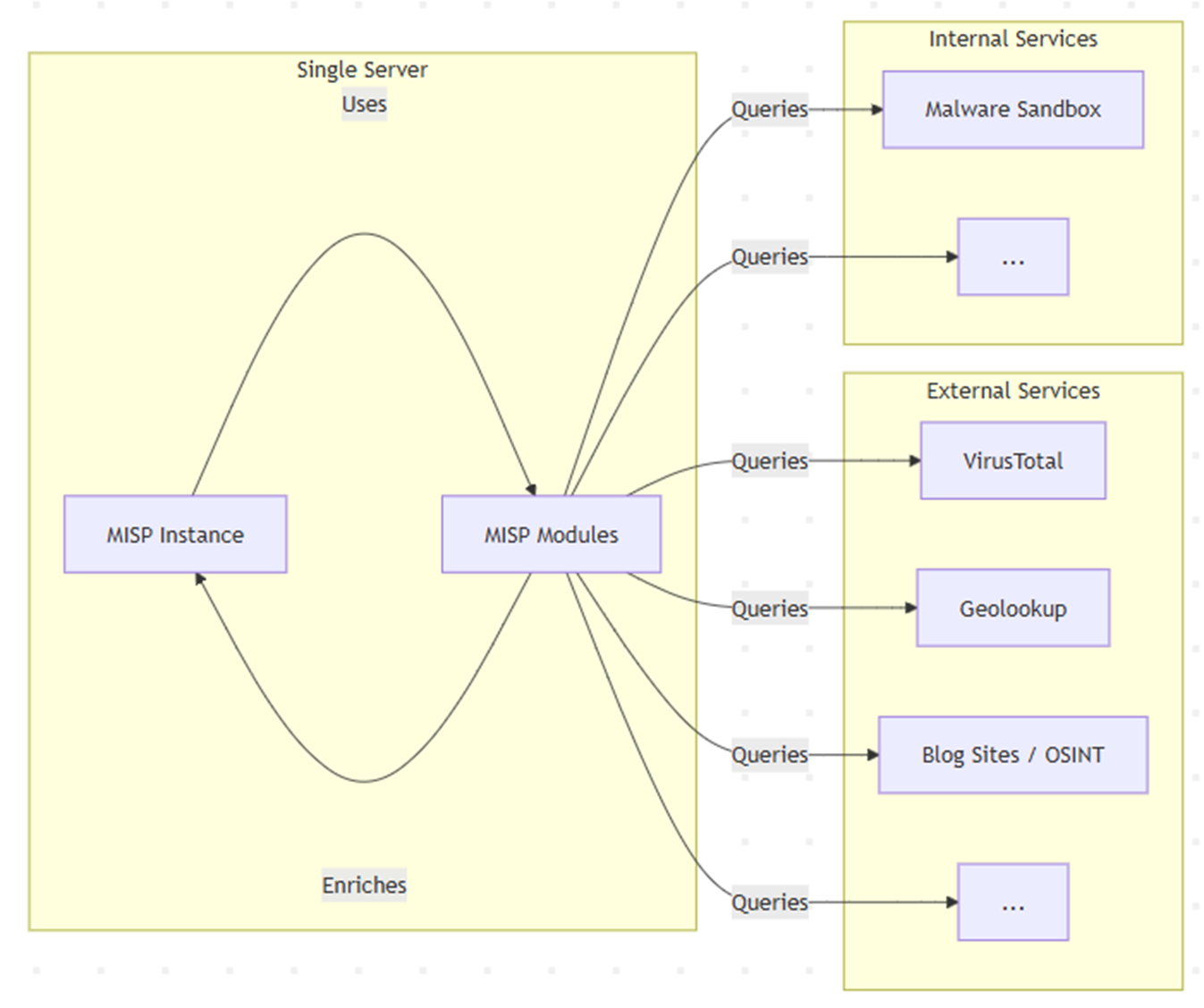 MISP has an extension mechanism called MISP modules. These are standalone additions to MISP, which can be used to extend import, export, enrichment, and other automation capabilities (workflows) of the platform. These are written in python, and hosted as a separate web service, typically only accessible through MISP.